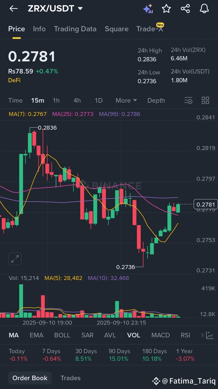 Hey, crypto trailblazer! If you're scanning for that next DeFi gem with real utility, look no further than 0x Protocol's ZRX. This isn't your average meme frenzy—ZRX is the backbone for decentralized exchanges, powering seamless ERC-20 trades on Ethereum and beyond. ZRX is hovering around $0.277, up a modest 1.06% in the last 24 hours with solid volume clocking in at over $31M. Market cap? A tidy $235M, ranking it #193—undervalued for its tech chops in a market where BTC's pushing $113K and alts are stirring. Recent buzz on X shows mixed vibes: some shorts calling for dips, but bullish setups emerging on daily charts with EMA crossovers and volume spikes signaling potential reversal. This short-term play (hours to 2-3 days) looks primed for a quick 8-15% upside if it holds key supports—perfect for scalpers eyeing the DeFi resurgence. Not financial advice, DYOR, and risk only what you can handle, but the charts are whispering opportunity. Let's break it down.