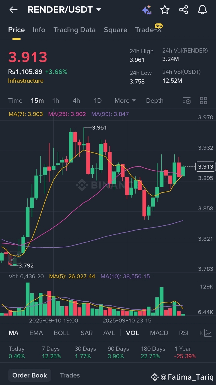 Hey, crypto visionary! If you're chasing the next big wave in AI and DeFi, Render Network's RNDR (now RENDER on Solana) is your ticket. This powerhouse connects idle GPUs with creators for decentralized rendering, powering everything from 3D art to AI models—think Hollywood meets blockchain. RNDR is cruising at around $3.77, up a crisp 1.5% in the last 24 hours with trading volume exploding to $137M+. Market cap? A robust $1.98B, ranking it in the top 70—undervalued amid the AI hype resurgence. X buzz is electric: Traders are calling breakouts from long-term downtrends, with longs targeting 70%+ pumps on solid support holds. This short-term setup (hours to 2-3 days) eyes 10-20% gains as DeFi and AI narratives heat up. Not financial advice—DYOR and trade responsibly—but the charts scream opportunity. Let's decode it.