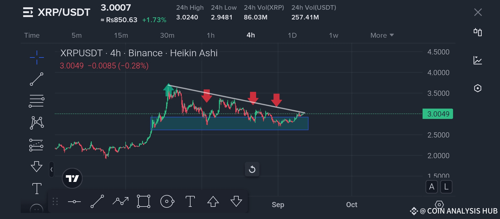 On the flip side, XRP has also been holding up strongly around the 2.80 – 3.00 USDT area, highlighted by the blue box. This zone is acting like a solid accumulation or demand area, where buyers step in to absorb selling pressure. Notice how price keeps bouncing back every time it enters this region – this is a sign of smart money accumulation.