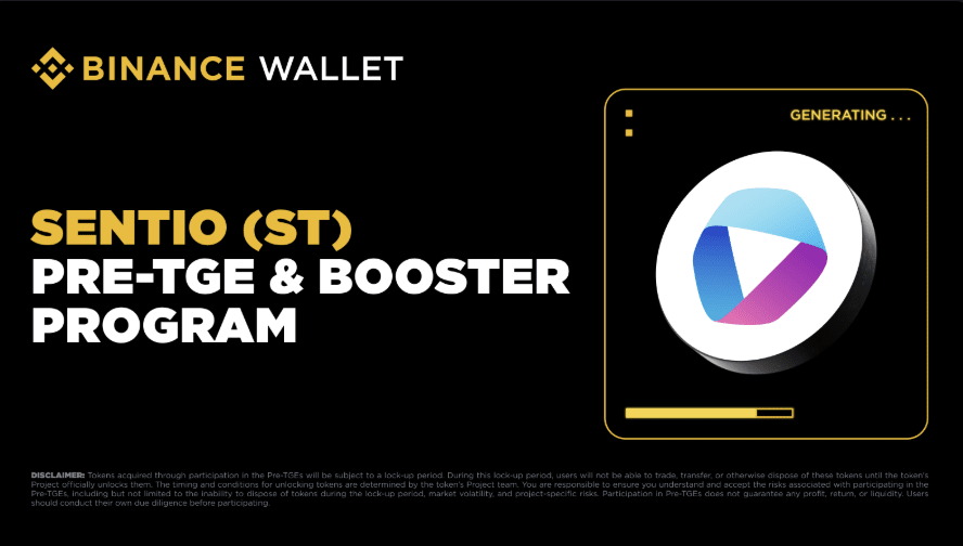 Binance has announced two exclusive initiatives for Sentio (ST) within Binance Wallet (Keyless): a Booster Program distributing 25 million ST tokens and a Pre-Token Generation Event (Pre-TGE) allowing early subscription before the token becomes tradable.
