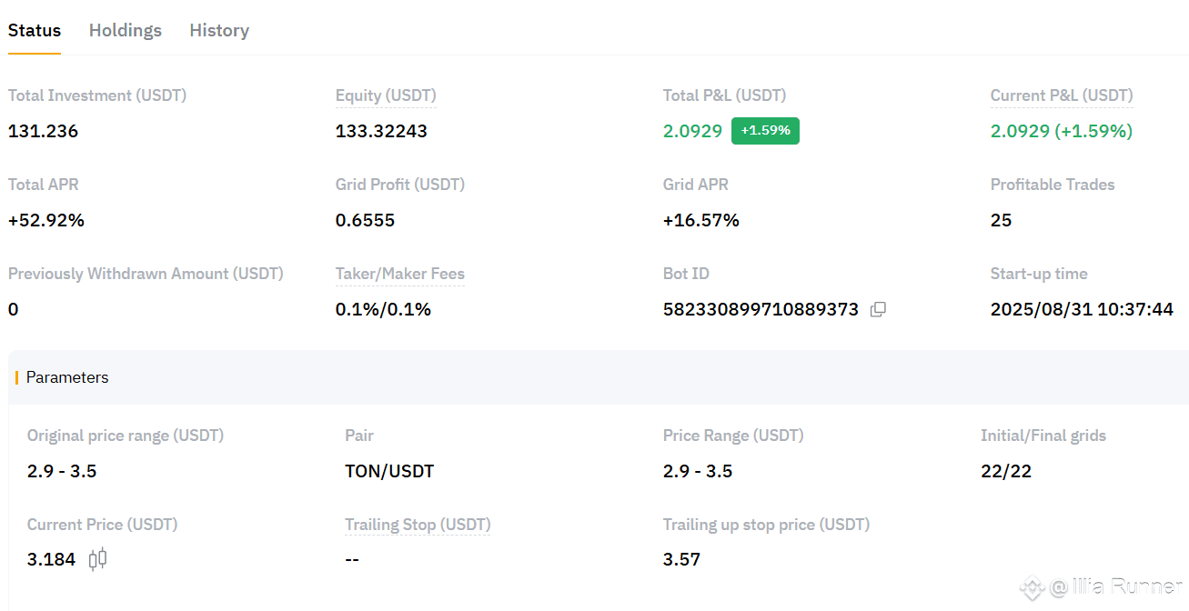 The current price of TON ($3.165) is sitting nicely in the middle of my grid. If TON continues to trade sideways within this channel, this bot is poised to continue performing steadily. A strong trend break would require a strategy reassessment.