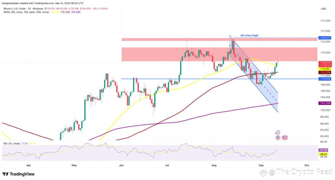 Support: The key support level to watch is $115,000. If the price falls below this, the next areas of interest are around the 50-day simple moving average (SMA) at $114,500 and the 100-day SMA at $112,200. A more significant support area is the local low from September 1st, which is between $107,200 and $110,000.