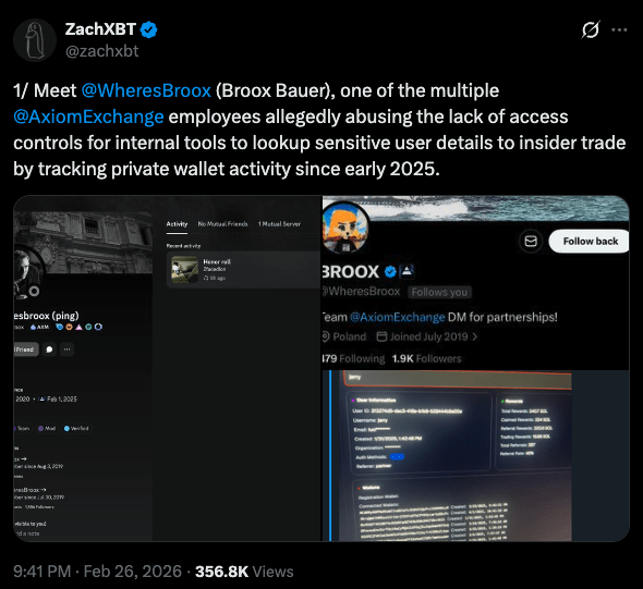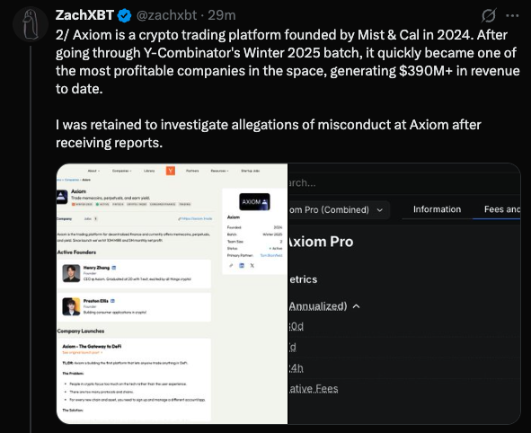 Crypto sleuth ZachXBT posted on X, revealing that the platform he has been investigating is Axiom. In his X thread, ZachXBT discloses that multiple employees of the cryptocurrency exchange Axiom Exchange are suspected of abusing their access to internal tools to track users' private wallet activities and engage in insider trading. ZachXBT stated that they were commissioned to independently investigate allegations of misconduct at Axiom.