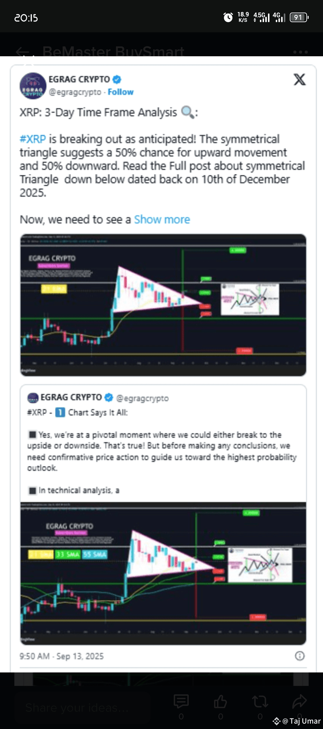 $XRP Egrag Crypto, a well-known market analyst, has zeroed in on a decisive setup forming on XRP’s three-day chart. In a recent post on X, he noted that the token is breaking out of a symmetrical triangle pattern that signals an even 50-50 chance of moving higher or lower.