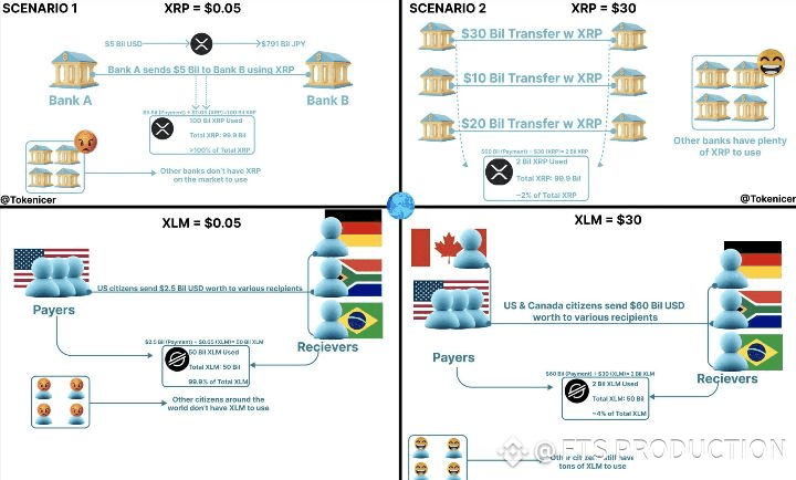 Now flip the case: if XRP and XLM are worth $30 each, the same $60 billion transfer would use only about 2% of the supply. Much easier, much more flexible.