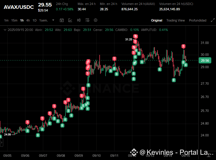 La tendencia principal de $AVAX durante este período ha sido alcista. El precio subió de aproximadamente $24.09 el 5 de septiembre hasta alcanzar un máximo de $31.28 el 12 de septiembre.