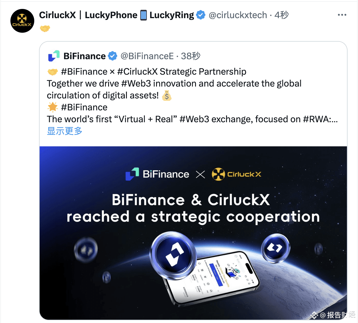 通过本次深度合作,CirluckX与 BiFinance携手打造“终端+资产+应用”全链路生态闭环,为全球用户带来更安全、更便捷、更创新的Web3沉浸式体验,加速行业深度融合,推动 Web3 技术向大规模主流采用迈进。