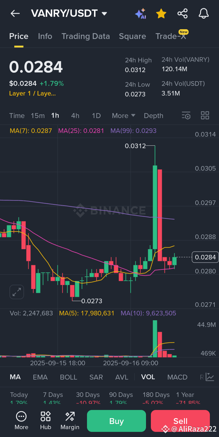 $VANRY Chain (VANRY) is a cryptocurrency that's currently trading at around $0.0287-$0.0302, with a 24-hour trading volume of approximately $3.2 million to $9.9 million. Here's a breakdown of its current market status and future price predictions: