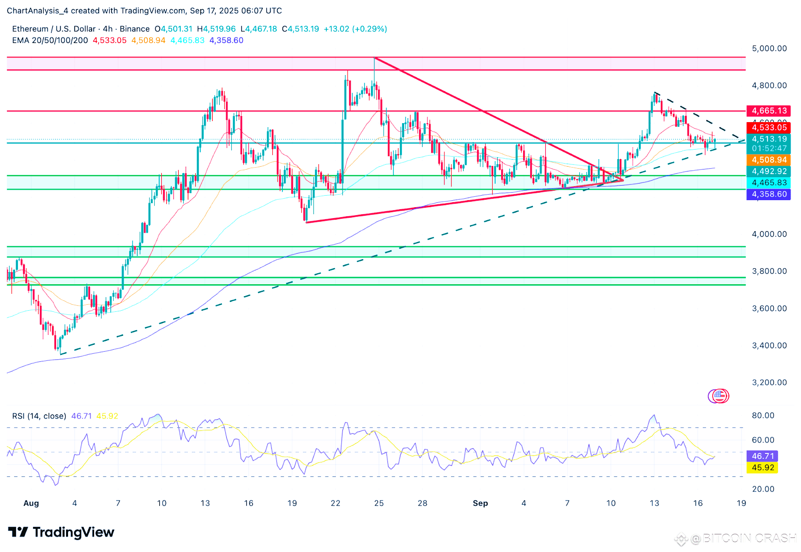 • EMA: $4510 — ближайшее сопротивление
