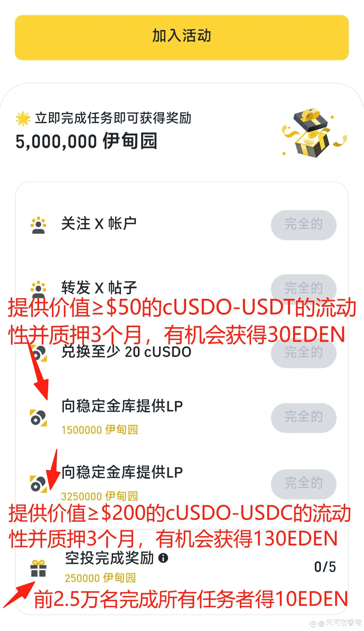 任务5️⃣质押价值200U的cUSDO-USDC LP3个月,领取130个EDEN奖励