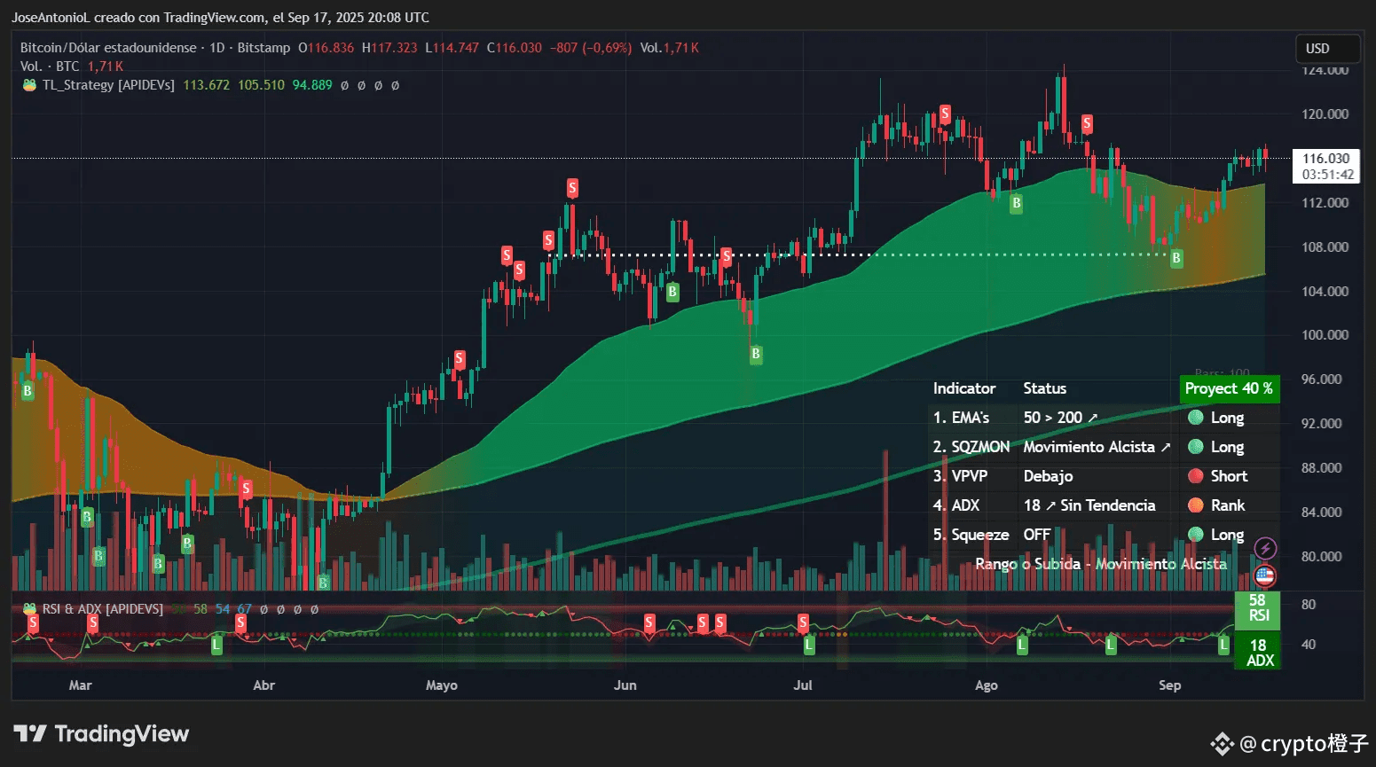 RSI(相对强弱指数):目前在58,属于中性偏多区间。RSI用于衡量价格动能,0到100之间,70以上为超买,30以下为超卖。比特币自8月下旬跌破50日均线(约11万美元)以来,动能有所恢复。