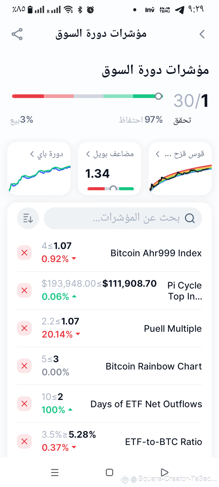 يعني مجموعة مؤشرات فنية تُستخدم لمعرفة أين وصل السوق (البيتكوين) في دورته: هل في بداية صعود؟ منتصف؟ قرب القمة؟ أم في مرحلة هبوط؟