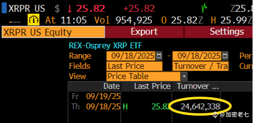 显示 Rex XRP ETF 交易数据的金融平台截图。股票代码为$XRPP,最新价25.82,成交量24,642,338,日期2025年9月18日,时间11:05,同时显示价格区间、最新成交和成交量等字段。