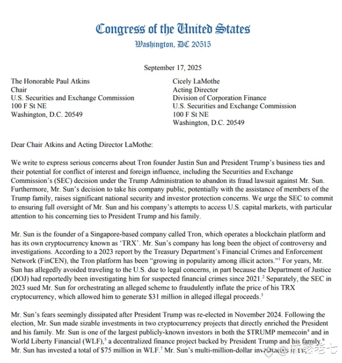 9月17日,美国民主党参议员Jeff Merkley与众议员Sean Casten联合致信美国证券交易委员会(SEC)主席Paul Atkins,对SEC提出严厉质询,要求其就暂停针对孙宇晨的执法行动以及波场通过反向并购登陆纳斯克等行为作出解释。