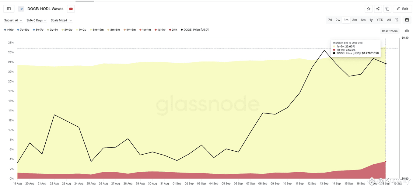 قام الحائزون الكبار بزيادة نشاطهم منذ أن هدأت الضجة حول خفض سعر الفائدة من قبل الفيدرالي وطرح ETF دوجكوين في CBOE (بورصة خيارات مجلس شيكاغو). زادت المجموعة التي تحتفظ بـ 100 مليون إلى 1 مليار DOGE أرصدتها من 26,7 مليار في 17 سبتمبر إلى 27,4 مليار في 18 سبتمبر.