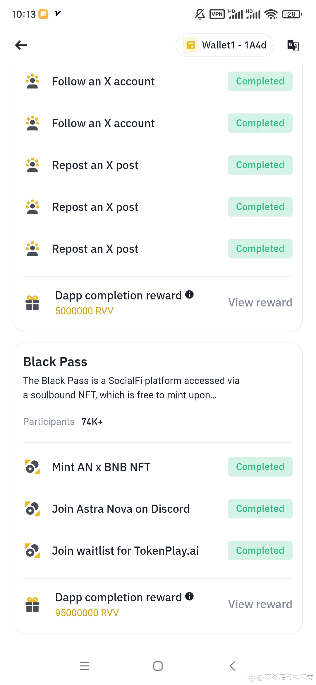 Astra Nova的钱包任务还有谁没完成,这个钱包任务比较简单,上次的小章鱼也是非常简单,随便转几个推文就20多u,这次任务一阶段也是转推文,二阶段黑色通行证稍微复杂点,需要注册一个discord账号,其他的按照要求弄就行,就说一个点,关联的时候点击币安图标,不然就会跳到谷歌商店了。简单操作一般毛都挺大,路过的老铁点点关注。