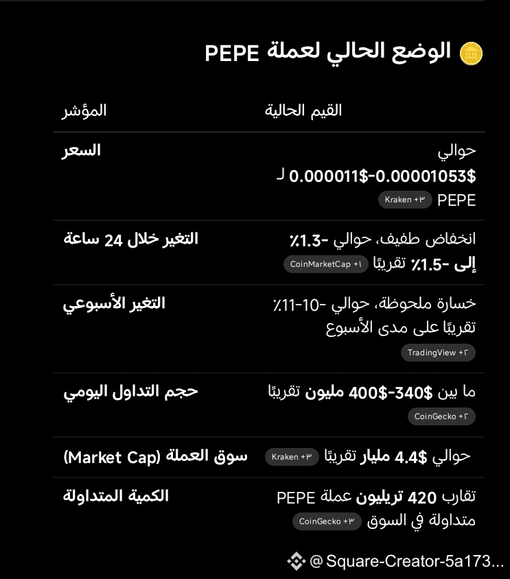 السعر حوالي $0.00001053-$0.000011 لـ PEPE