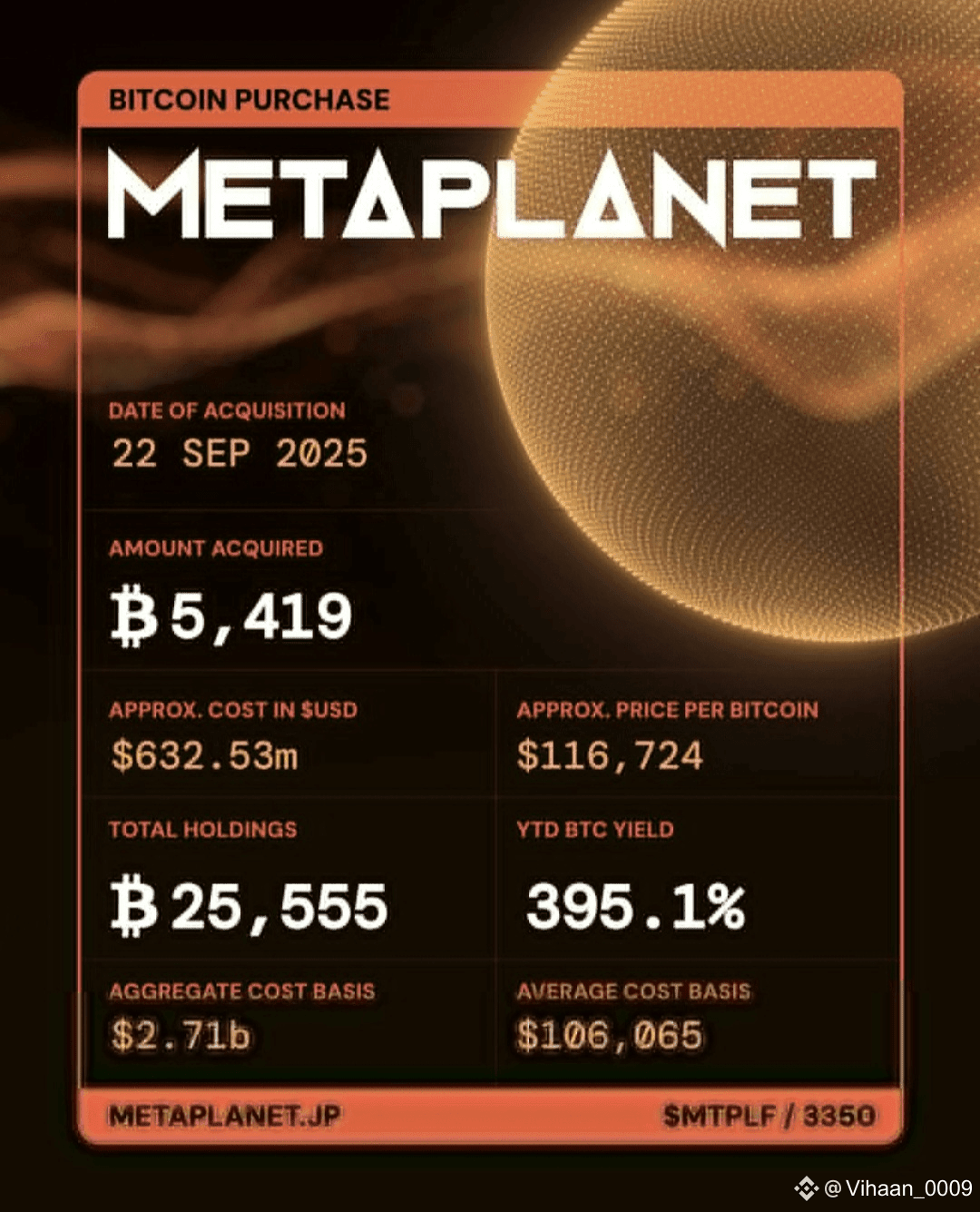 Metaplanet just scooped up 5,419 BTC (~$632.5M) at an average price of $116,724/BTC.