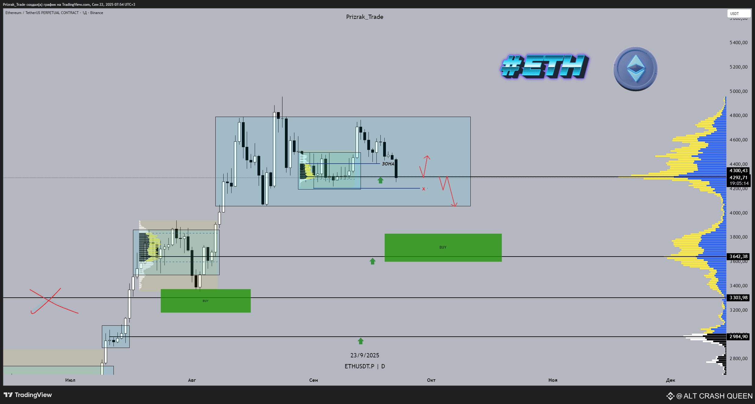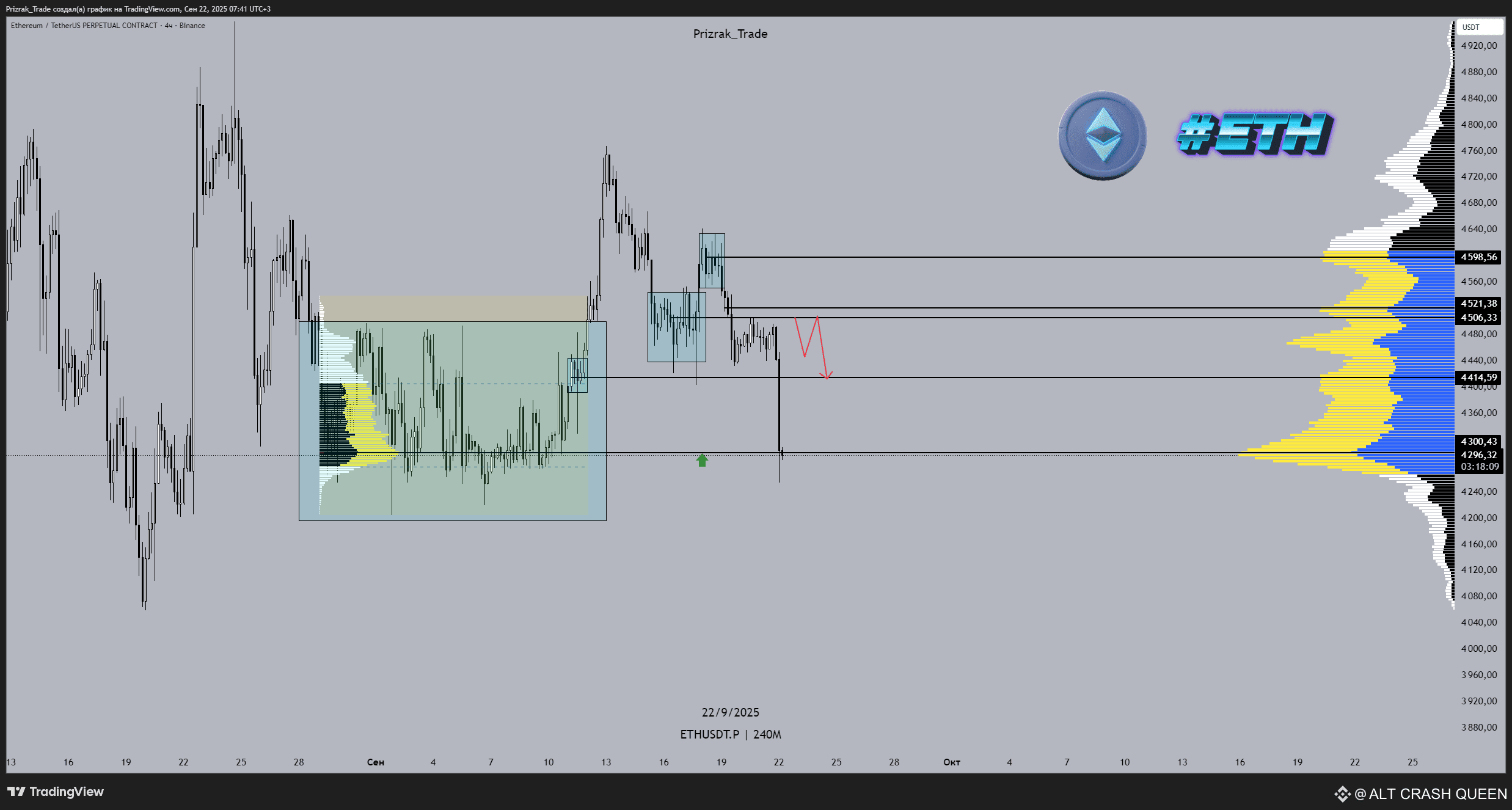 • Шорт-сценарий $ETH отработан — цена подошла к ключевой поддержке $4300