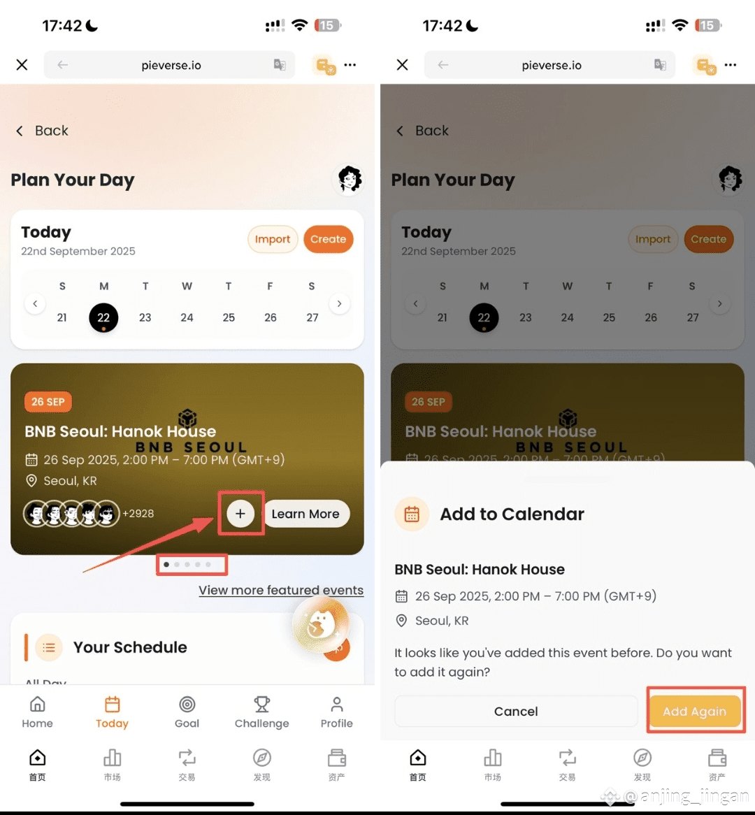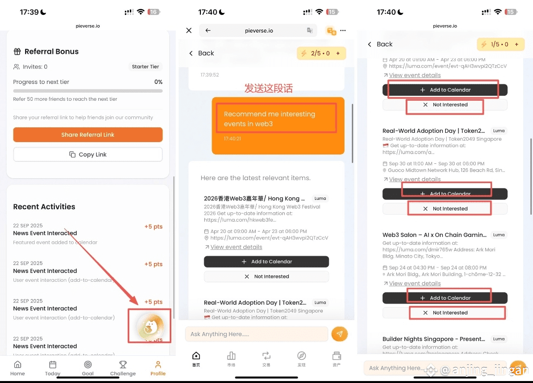查看推荐事件列表,点「Add to Calendar」 或 「Not Interested」当日累计 ≥3 次,累计 5 个不同的 UTC 日完成