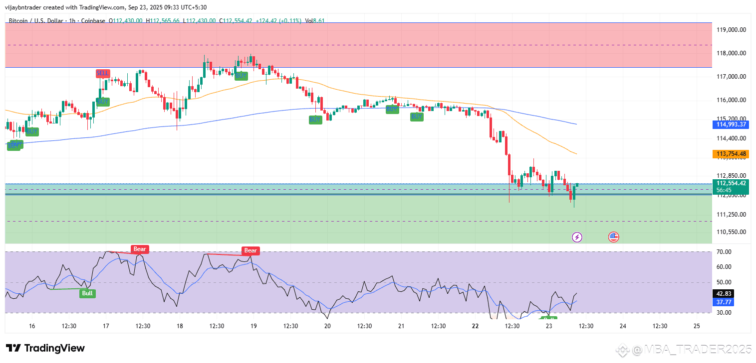 Active zone: Price is oscillating inside 112.85k–112.20k 1h demand with repeated wick responses, but needs acceptance back above 113.75k–114.30k to neutralize immediate downside pressure.