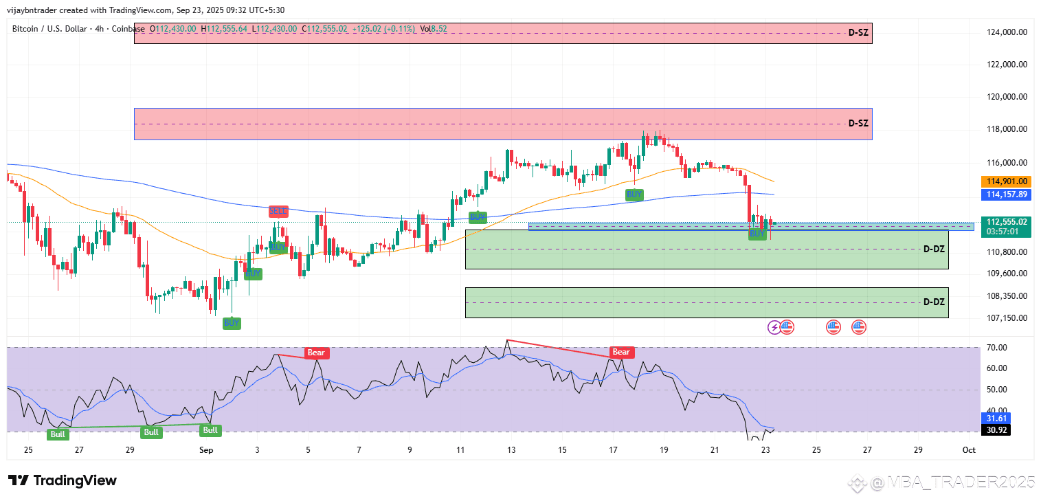 Support: 112.90k–111.30k is the first daily demand, with a deeper daily demand step at 109.20k–108.30k if weakness persists.