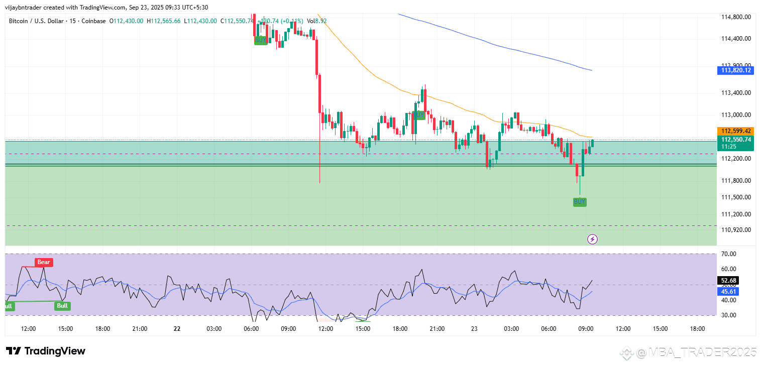 BTC is bouncing off intraday demand around 112.85k–112.20k, but 1h/4h momentum remains below the RSI 50 midline and price is still under declining moving averages, so only a reclaim and close back above 114.99k–115.20k would set up a higher‑quality retest of 116.30k and 117.80k–118.20k supply. If 112.20k gives way on a close, expect continuation into 111.70k and potentially the deeper 109.20k–108.30k daily demand ladder before buyers try again.