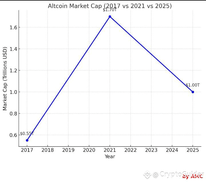 Es ko ghoor se dekhna ye Alts ke markit cap ha 1 side or 2nd side horizontal me me NY year share kiye es grap ko samjo to Samaj me Aaye ga k 2017 k alts ke ralley ko compare karo to 2025 ka alts season complete ho Chuka ha but if we compare it with 2021 ye almost complete hony k kareeb ha sub k mind me 1 question Aaye ga 2017 me to coin 20x howy the and 2021 5x to 10x but 2025 me ASA howa e nhe so alts season kesy ..