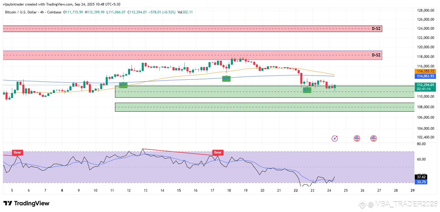 Zones: Active 4h demand 112.9k–111.3k has reacted multiple times; if it fails on a close, the next 4h demand sits ~109.3k–108.1k.