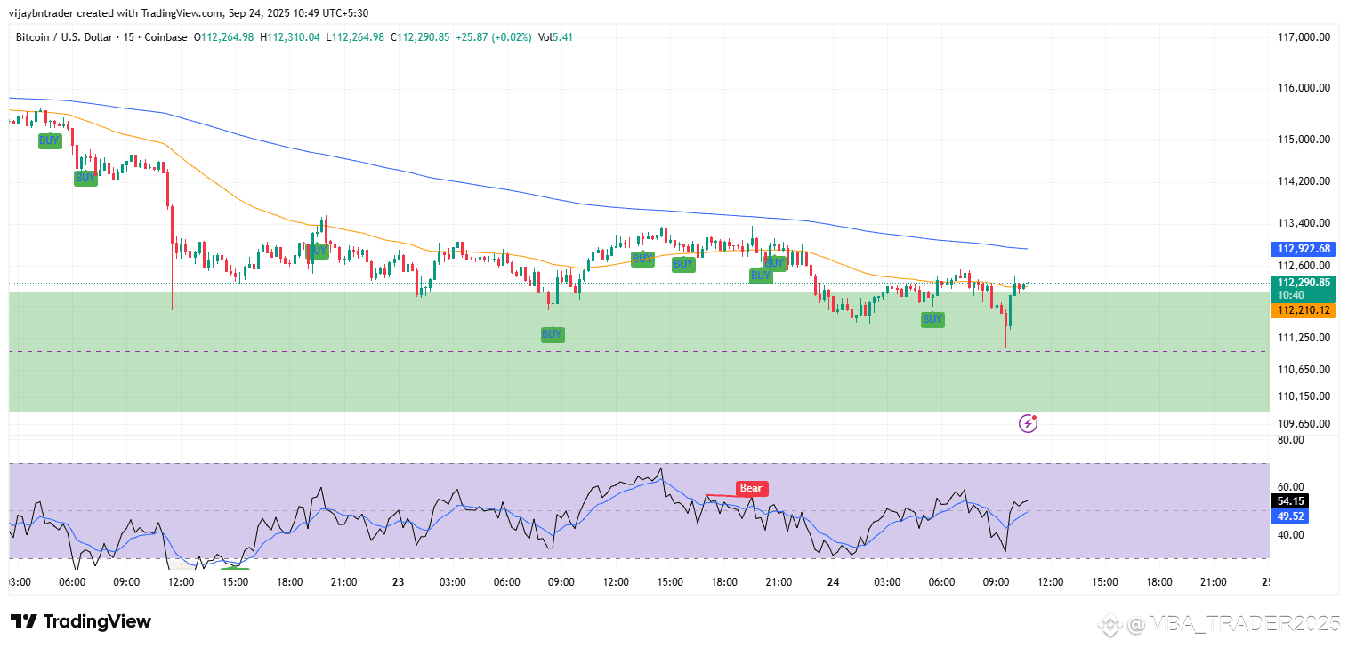 Condition: Bullish reversal candle inside 112.90k–112.20k and 1h RSI reclaim >50.