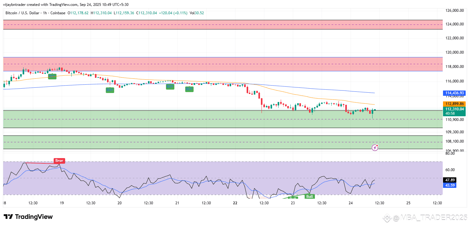 Failure case: Hourly close below 112.20k with RSI <50 confirms continuation to 111.70k and 109.30k–108.10k.
