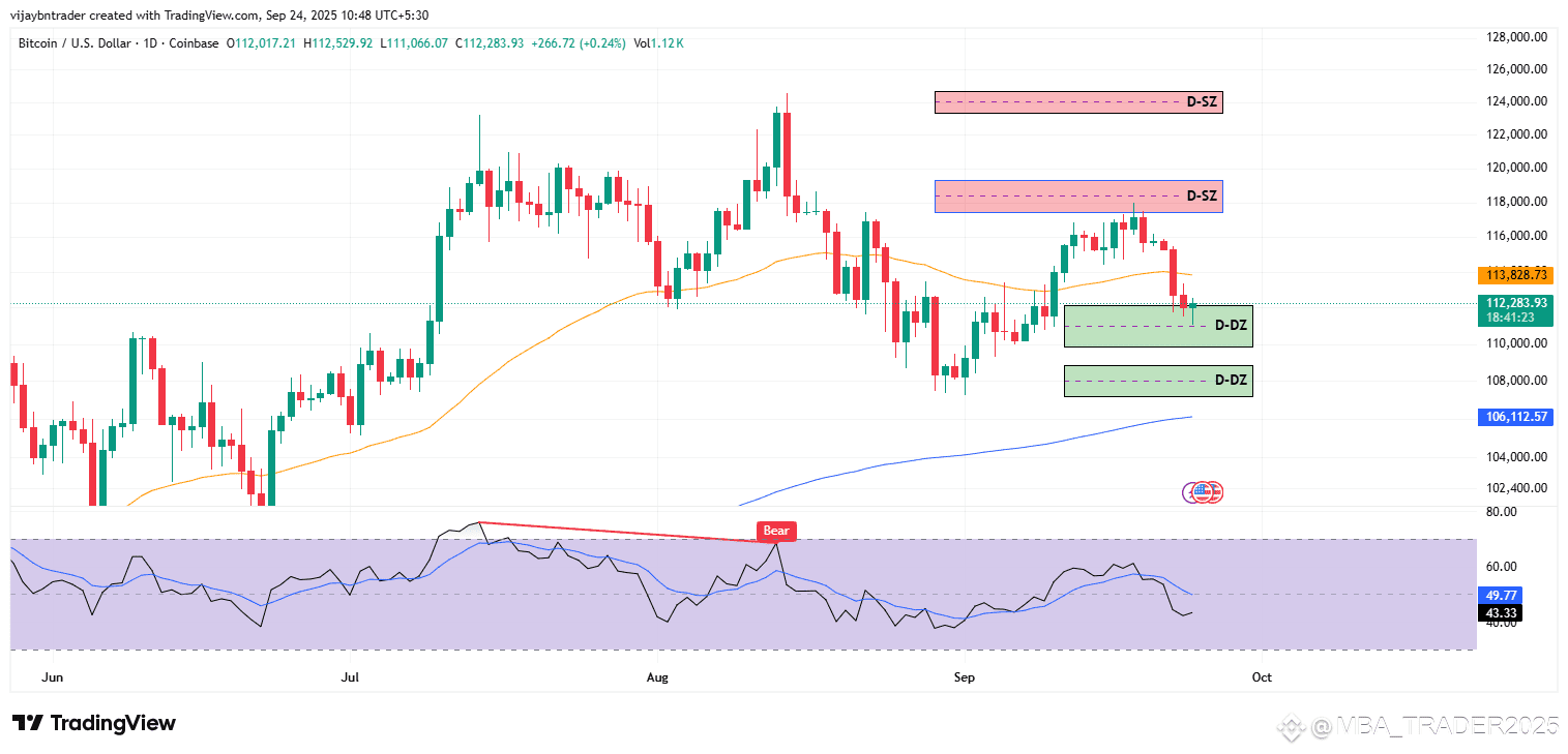 Structure: Price pulled back from 118k supply and is probing layered daily demand at 112.9k–111.3k with a deeper shelf near 108.8k–108.0k; reversals are statistically best when formed at well‑defined demand.
