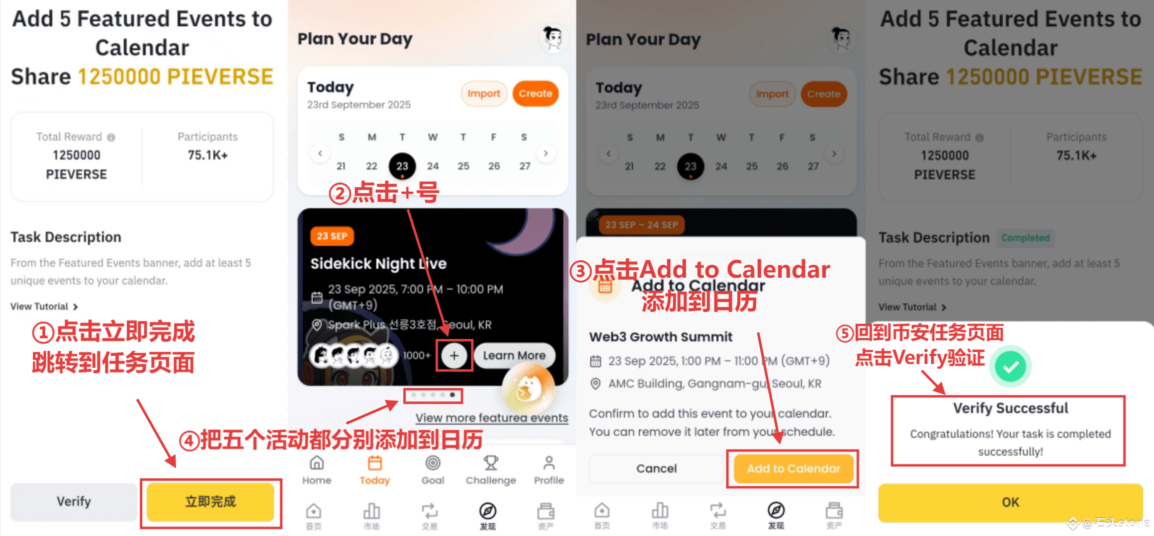 任务七:将5个特色活动添加到日历,跳转到任务网页后点击“+”号,然后点击Add to Calendar添加到日历,确保把页面中的五个活动都分别添加一遍,完成后回到币安任务页面点击Verify验证