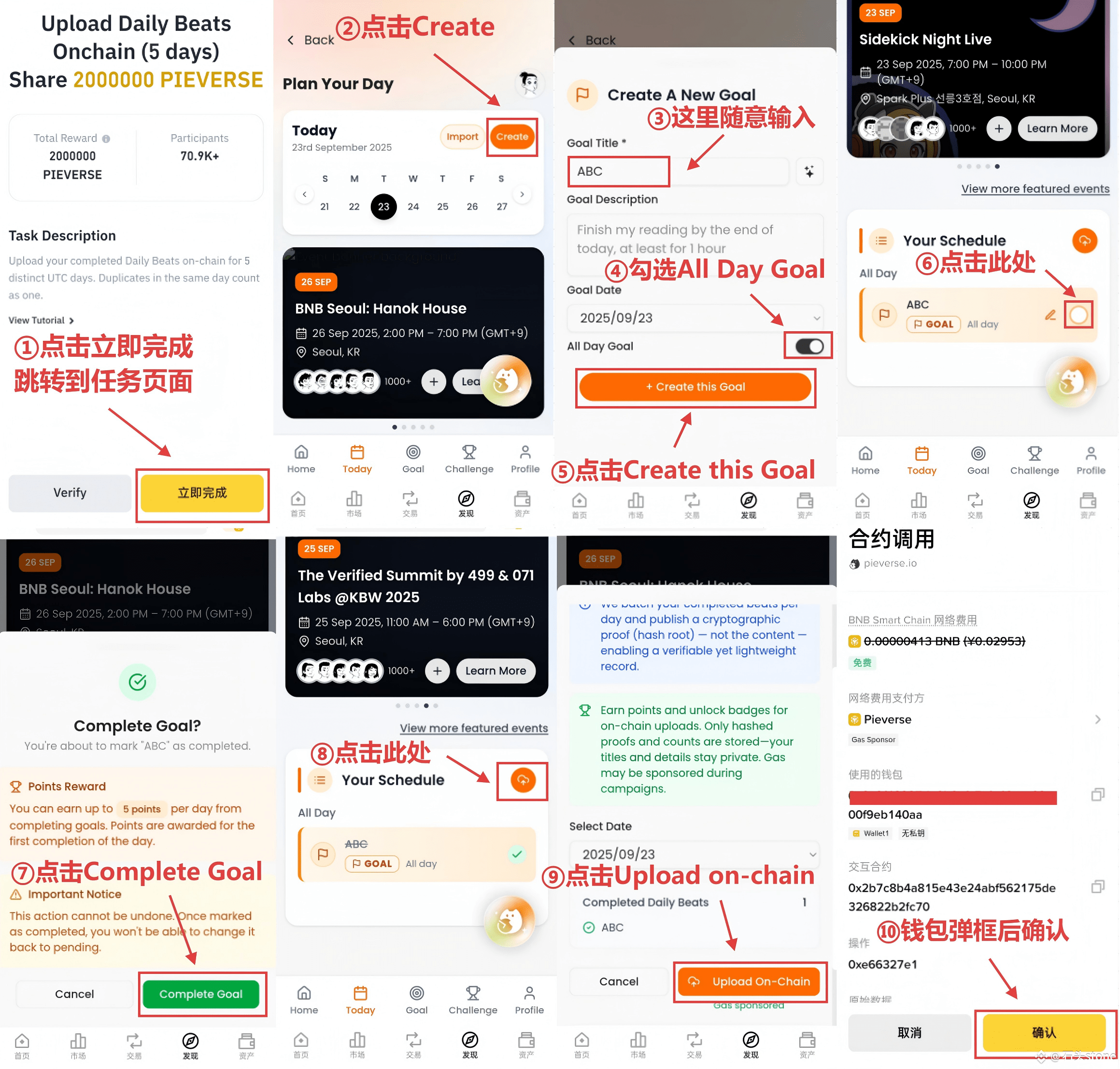 跳转到任务网页后,点击页面右侧的Create,输入Goal Title后,勾选All Day Goal,再点击Creat this Goal, 点击Complete Goal标记完成后, 点击上传图标,然后点击upload on-chain,钱包弹框后确认