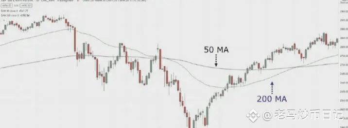 下图蓝线是 50 MA,黑线是标普500 指数日线图上的 200 MA: