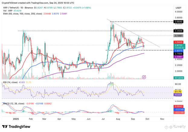 أما بالنسبة لـ XRP، فإن الثيران تظهر علامات على استعادة السيطرة بعد ستة أيام متتالية من الانخفاضات. يبرز الرسم البياني اليومي مستوى دعم قصير الأجل عند المتوسط المتحرك الأسي لمدة 100 يوم، حوالي 2.83 دولار، مدعومًا بمؤشر القوة النسبية الصاعد عند 43.