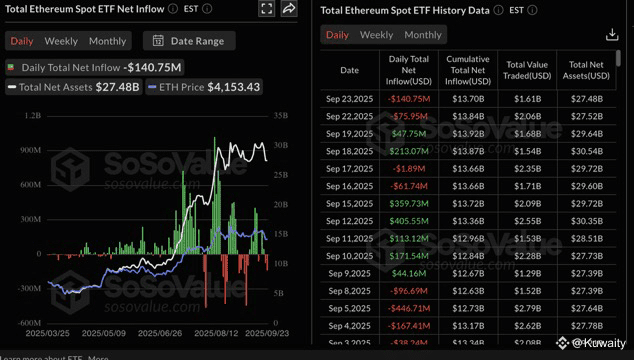 وفقًا لبيانات SoSoValue، شهدت صناديق ETH في الولايات المتحدة تدفقات خارجة تبلغ حوالي 141 مليون دولار يوم الثلاثاء و76 مليون دولار يوم الاثنين.