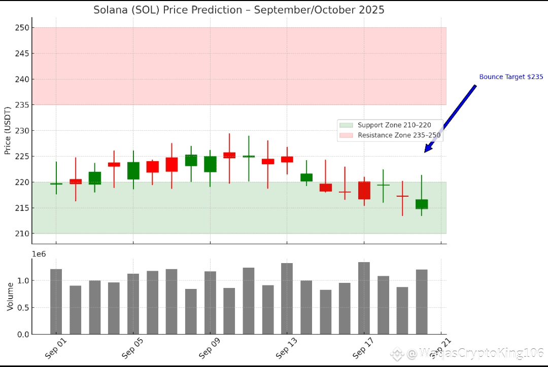 SOL is trading in the $218–$225 range after a recent pullback.