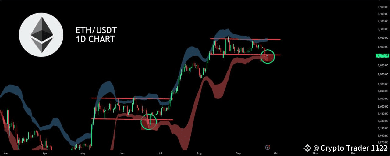 • 🔴 Support Zone: Around $3,800 – $3,900, marked by recent bounces highlighted in the chart’s green circles.