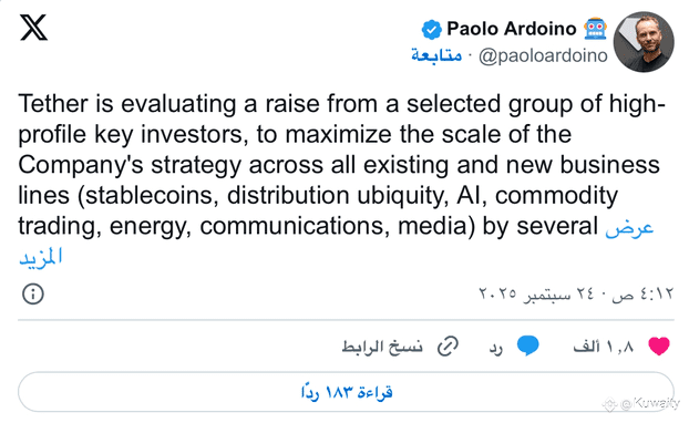 تُجري شركةTether Holdings محادثاتٍ مع مُستثمرين لجمع ما يصل إلى 20 مليار دولار في صفقةٍ من شأنها رفع تقييم الشركة إلى ما يقرب من 500 مليار دولار، ما يجعلها ضمن مجموعة أكبر الشركات الخاصة في العام من حيث التقييم.