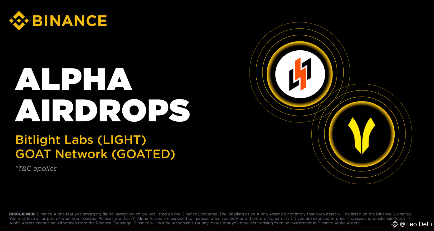 Big news from Binance Alpha: Bitlight Labs ($LIGHT) and GOAT Network ($GOATED) will officially launch on Sept 27. Eligible users can claim their airdrops using Alpha Points on the Alpha Events page once trading goes live.