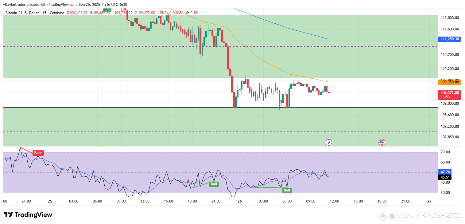 Momentum: 15m RSI is oscillating in the mid‑40s, so expect mean‑reversion unless a thrust pushes RSI >50 and holds above 109.75k on a retest.