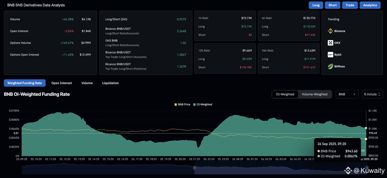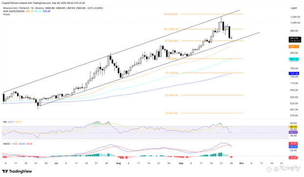تتداول عملة (BNB) 944 دولار بعد انخفاض بنسبة 7% في اليوم السابق. في وقت كتابة هذا التقرير، تمتد خسائر BNB بنحو 1% يوم الجمعة، مقتربًا من خط دعم قناة صاعدة. تشير كل من المشتقات والتوقعات الفنية إلى تراجع مفاجئ في ضغط الشراء، مما يبرز مخاطر تصحيح إضافي.