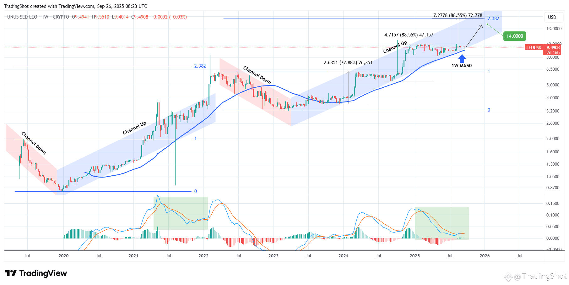 Unus Sed Leo (LEOUSD) has been trading within a Channel Up for the entirety of its current Bull Cycle. Lately it has been trading sideways since the August 11 High, but still strongly supported by the 1W MA50 (blue trend-line).