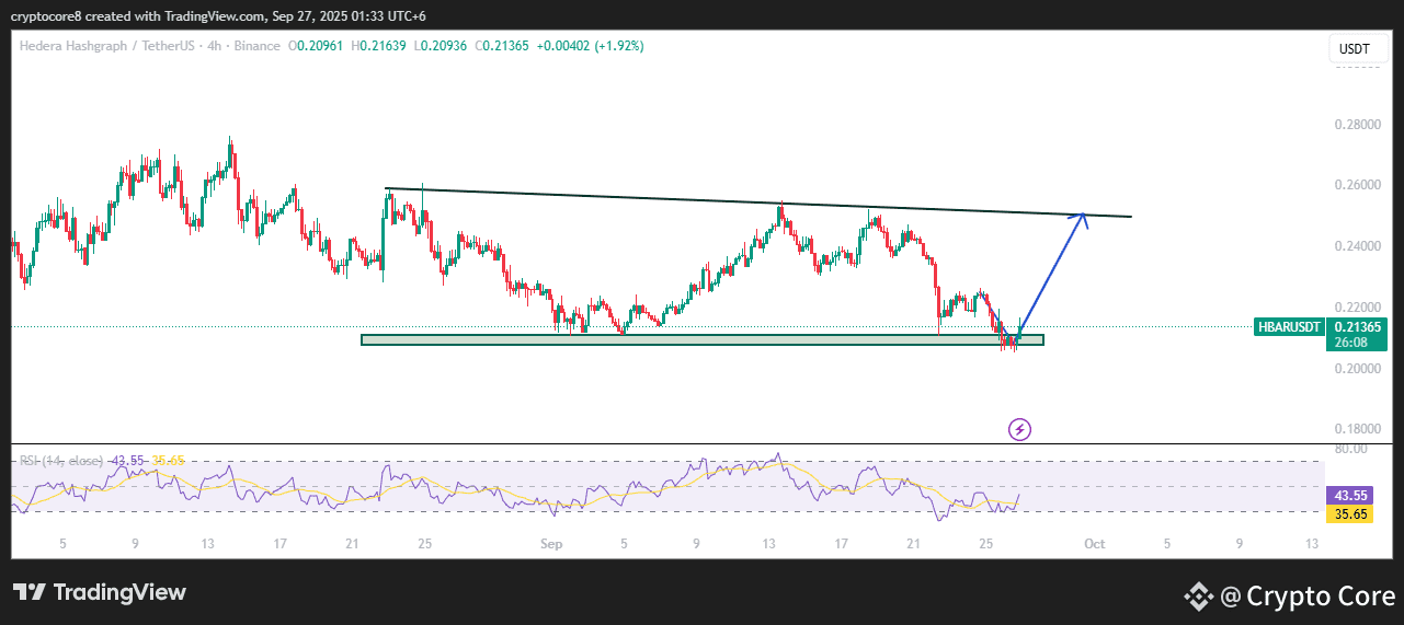 This HBAR chart shows the price bouncing from strong support, with RSI recovering from oversold levels. The blue arrow suggests a bullish move toward the resistance trendline. Buyers stepping in here could push the price higher, signalling potential upward momentum in the near future.