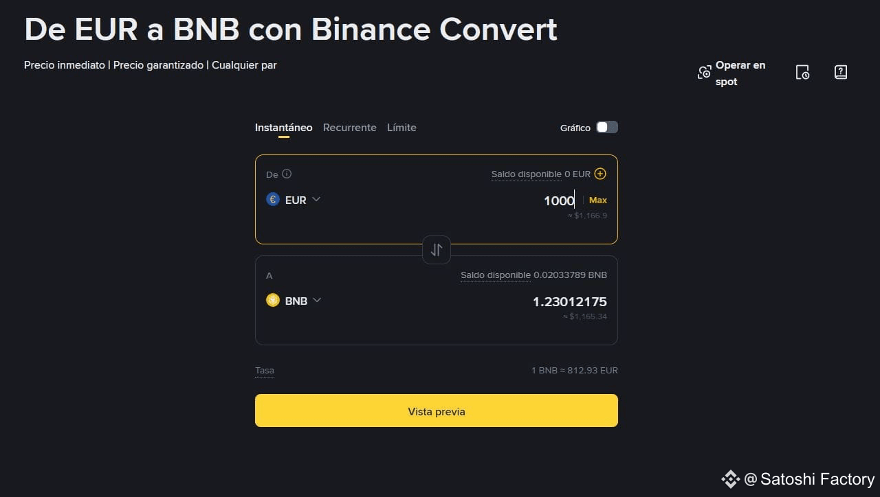 Compra Directa con Euros (EUR): Esta es la opción más fácil. Si la criptomoneda tiene un par de trading con EUR (por ejemplo, BNB/EUR), la puedes comprar directamente con tu dinero depositado con un solo clic.