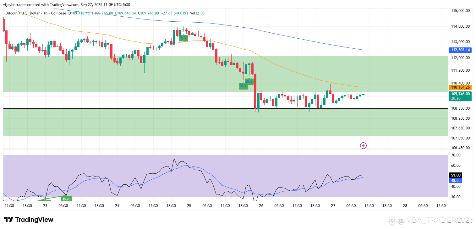 Demand‑reaction long: If price dips to 109.0k–108.6k, wait for a bullish reversal candle and RSI reclaim >50 before entry; invalidate on a 1h close <108.6k.