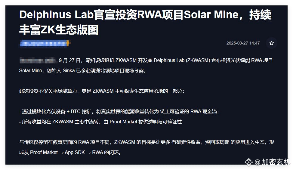 9月27日,零知识证明虚拟机ZKWASM的开发商Delphinus Lab,直接砸钱投了澳洲光伏项目Solar Mine。简单讲,就是通过模块化光伏设备挖矿,把太阳能发电的收益变成链上可验证的资产,所有现金流都在ZKWASM生态里流转。这可不是空谈概念,而是实打实让绿能收益“上链”,用零知识证明技术保证透明性!