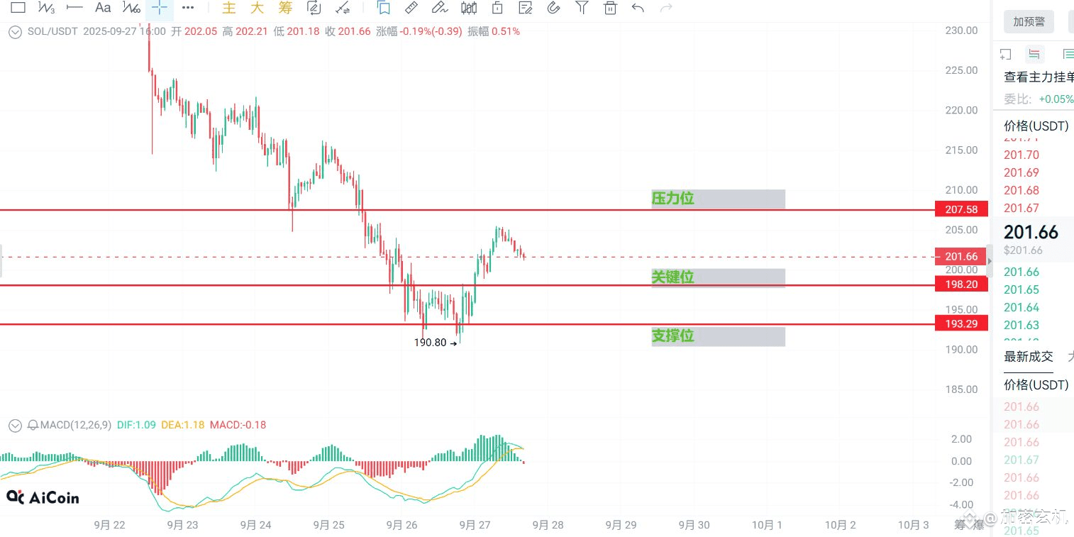 不过,9月26日SOL砸到190.8美金后快速反弹,说明下方有买盘撑着。现在价格在200美金附近缩量震荡,属于典型“方向选择前夜”。如果能放量突破207.58压力位,下一目标直奔215美金;但如果跌破200美金,可能回踩193支撑。