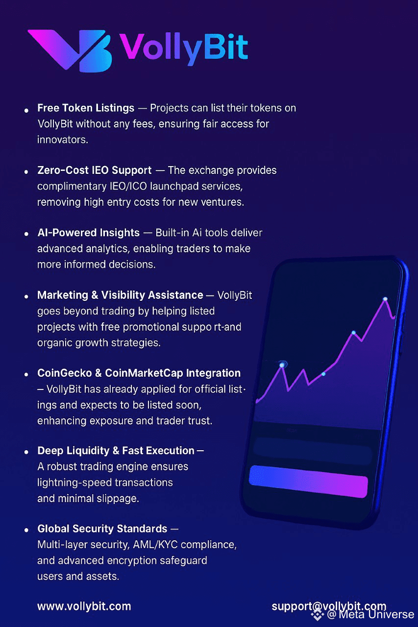 • Free Token Listings — Projects can list their assets on VollyBit without any fees, enabling faster adoption and visibility.